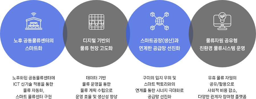 신기술이 적용된 공유물류 시설의 활용, 산단 유휴 물류자원의 공동 활용, 스마트 공장과 물류플랫폼의 데이터 연계를 통해 생산부터 유통의 전체 공급망에 대한 물류 서비스를 제공합니다.